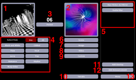 This window shows the next scene that will be displayed. To change it click the window itself or use the Scene (6), Image (7) or Video (8) Buttons below the window. The window will change automatically to a new random scene every set time period (3).