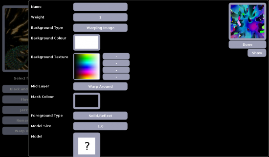 Model - Many of Morphyre's scenes use 3D models. In these scenes, you can choose the 3D model that appears. In the menu that appears, the '?' means use a Random model each time, and 'From Image' allows you to turn a (simple) image (for example a logo) into a 3D model.