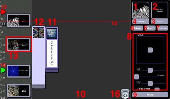 This shows the currently chosen fade (fades are the transitions between scenes). Tap it to bring up a new fade at random or use the Fade Button (3) to choose a particular fade.