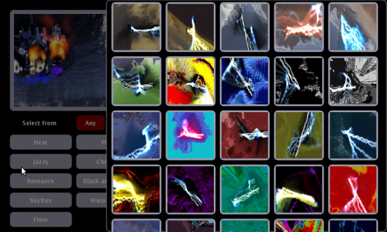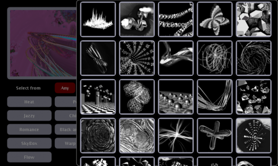 The scene menu first presents you with a scrollable list of scene types, displayed as black and white Thumbnails (as in the image above). Tapping on one of these will present another list of available colour schemes using that scene (as in the image below). However if there is only one available colour scheme then the scene will start playing immediately without going through the colour scheme menu.